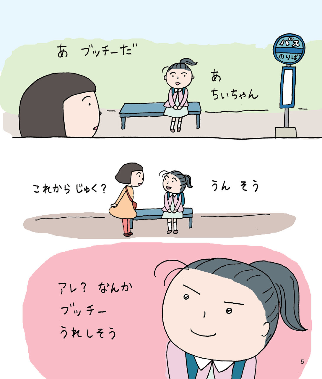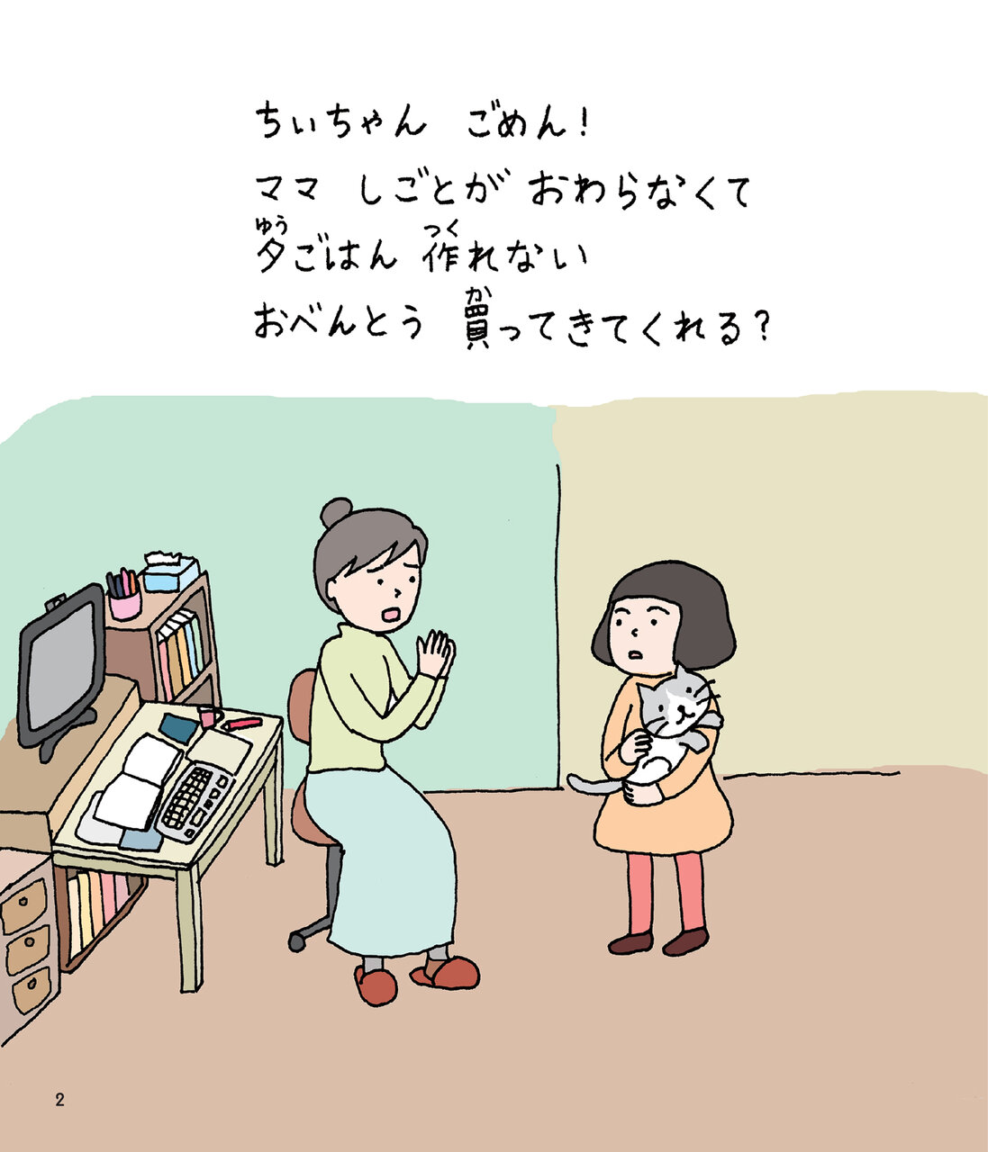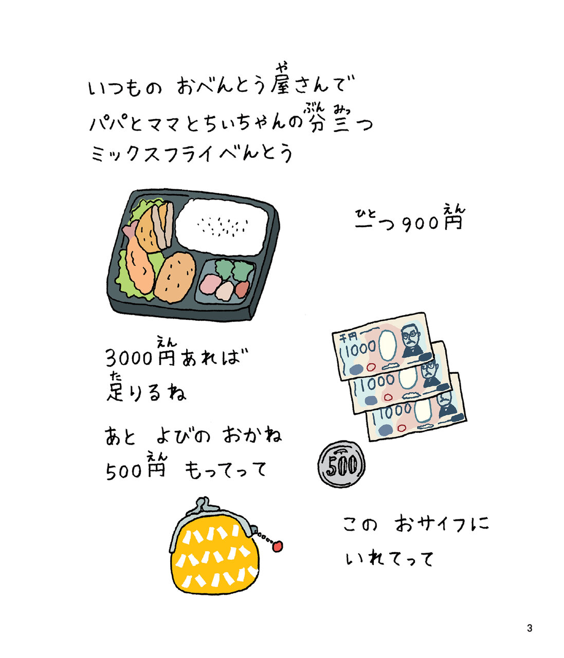 主人公のちぃちゃんは、ママからお弁当を買ってくるようおつかいを頼まれます。3,500円を握りしめて出かけたものの、なんだか胸がドキドキ……。お金を持っていることに、少し不安を覚えます。