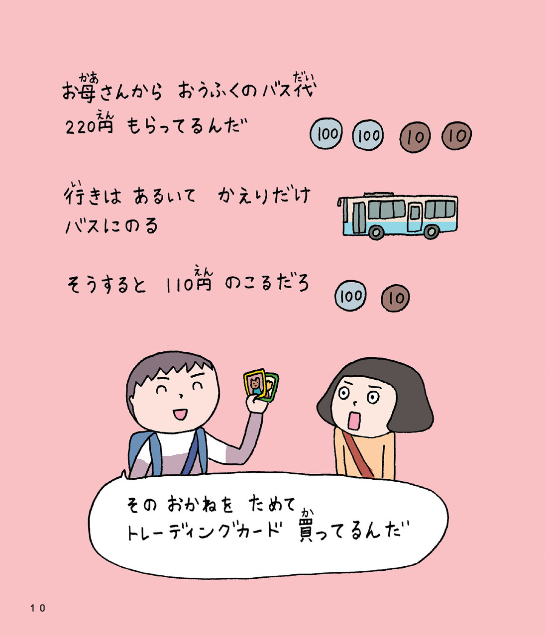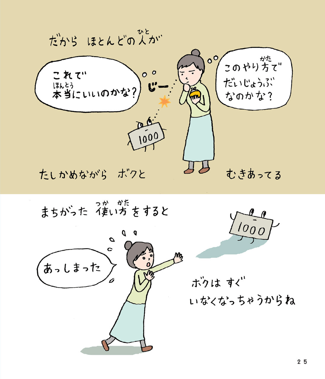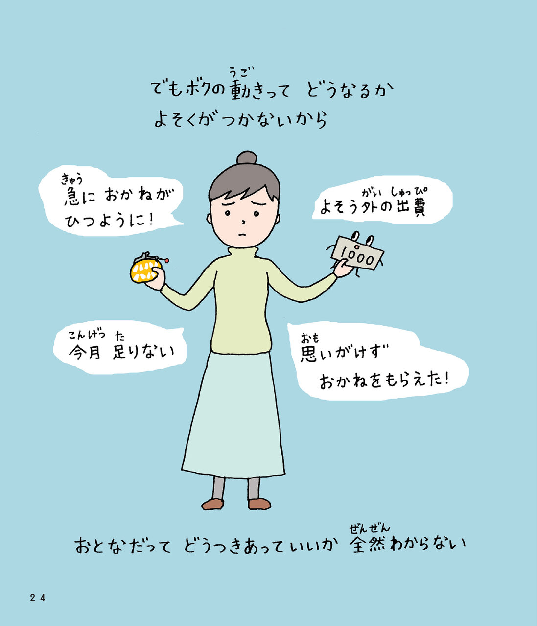 お金を手にしてうれしい気持ち、少し不安な気持ち、そして使うときのドキドキ――それは大人になっても変わらないもの。お金に振り回されないようになるには、“相手を理解する”ことが大切です。本書はそんな気づきを、かわいいイラストとやわらかな書き文字でそっと教えてくれます。