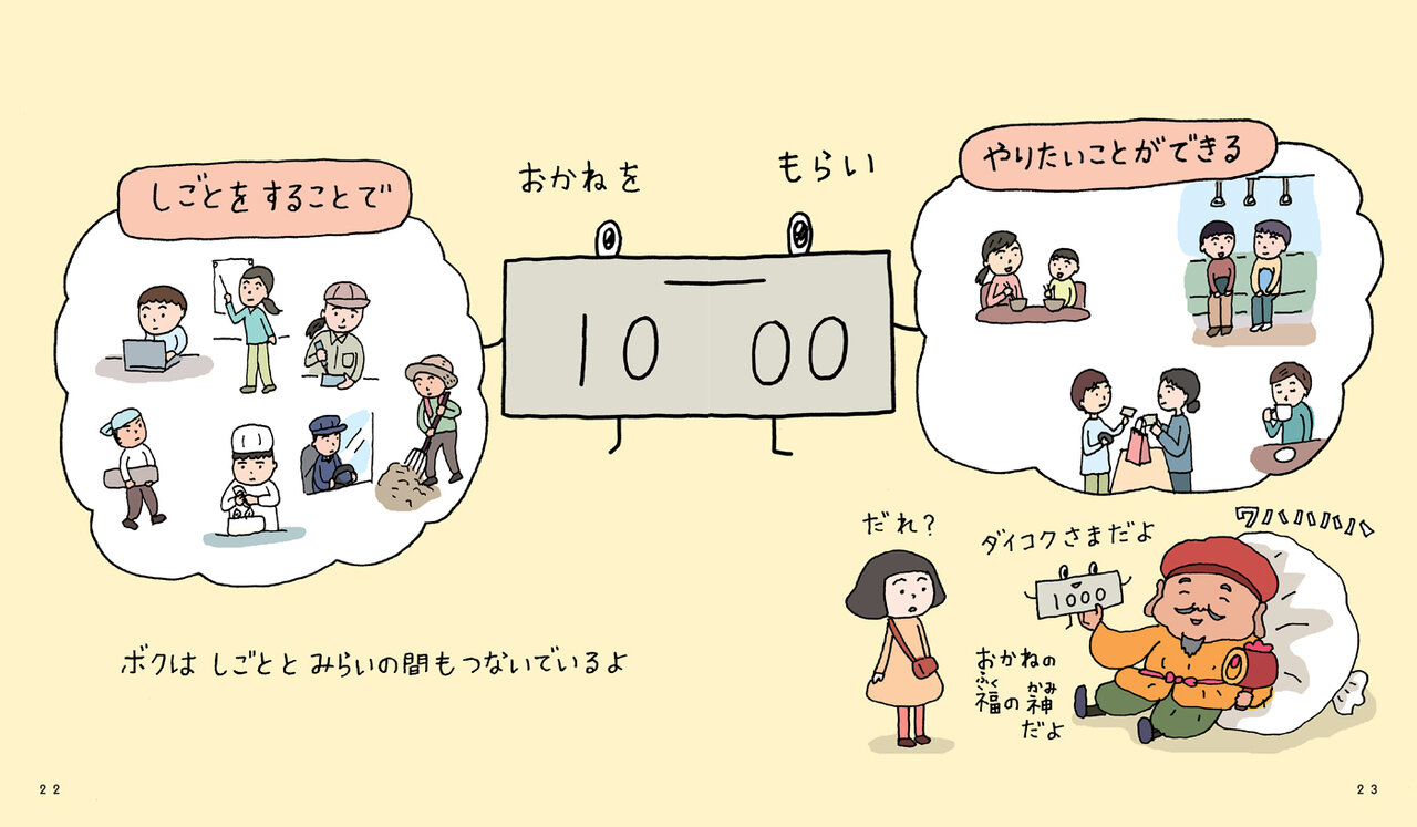 そして、冒頭の3人の子どもたちはそれぞれ「お金との経験」を積み、自分たちの引き出しにしまいます(ジュンくんはしっかりとお母さんに怒られてしまいましたが)。この“引き出しを作る”経験は『みらいってなんだろう』にも描かれており、未来への選択肢の糧にもなっていきます。