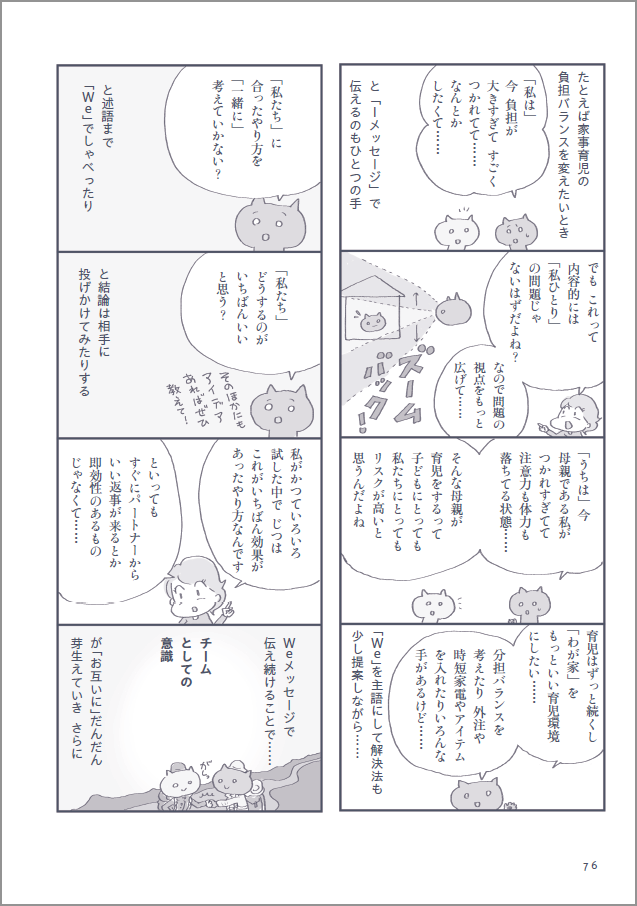 私自身、特に心に響いたのはパートナーとのコミュニケーションに関するヒントです。協力的であるはずの夫に対しても「そうじゃない」「もっとこうしてほしい」と思ってしまうときがあり、どうすり合わせればいいのか分からないまま自分で抱え込んでしまうことがありました。