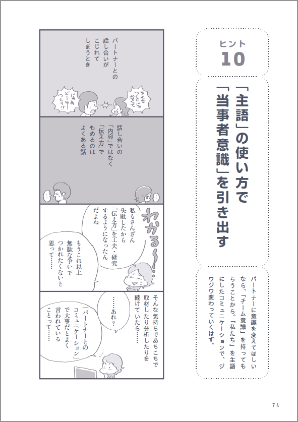 たとえば<ヒント10「主語」の使い方で「当事者意識」を引き出す>では、「あなた」「私」ではなく「私たち」を主語にして話すことを提案しています。