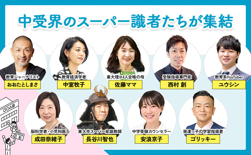 教育経済学者 中室牧子/教育ジャーナリスト おおたとしまさ/受験指導専門家 西村創/東大理III合格4人の母 佐藤ママ/脳科学者・小児科医 成田奈緒子/中学受験カウンセラー 安浪京子/教育系YouTuber ユウシン