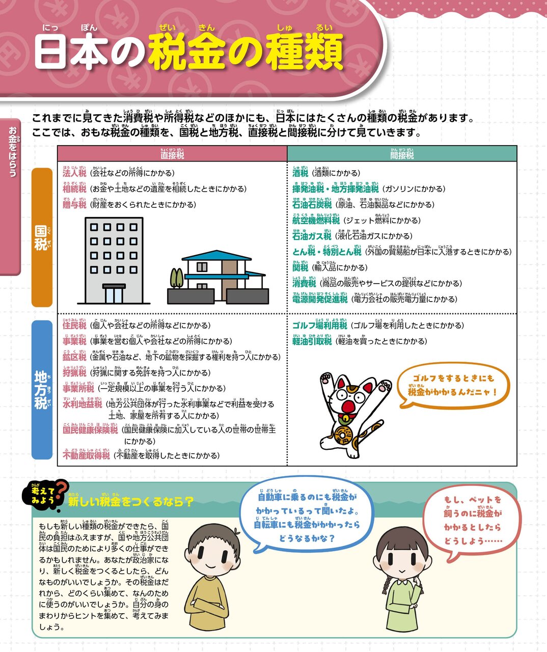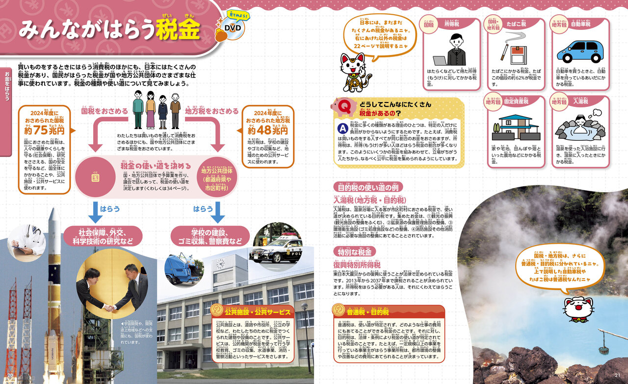 あと、容赦なく明かされる年収! 国家公務員の平均年収(約689万円)、タレントの平均年収(235万円)、YouTuberの平均年収(1チャンネルあたり約41万円/有名事務所所属の場合)……。年収の数字なんて「一概に言えない」ってことで、あまり明確に書いてある本を見たことない。「日本銀行ってなんだろう?」のページでは、日本銀行総裁の植田さんの年収(3607万円)まで明らかに。「そんなことを“豆知識”として子どもにインプットしてどうする!」と、思わないでもないが……、面白い。子どもに身近なところでは、教室の黒板は約13万円(高いな!)、教科書1冊が約100~1000円(安いな!)ってところから、教育費として使われる税金の額、1授業時間あたり約1011円とか、「へぇ?!」と思う知識でいっぱいだ。