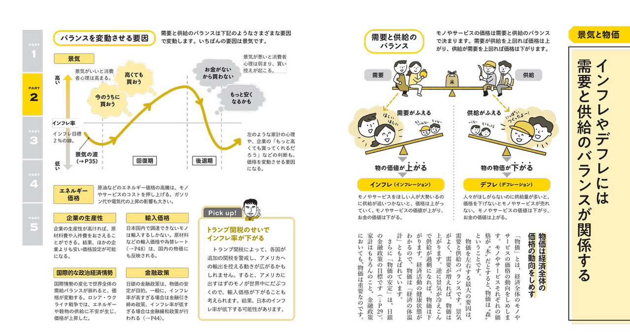 まずは「お金の成り立ち」や「景気・為替」といったマクロな経済視点から始まります。「なぜ金利が動くのか」「なぜ株価は変動するのか」という大きな流れを掴むことで、中盤の「働き方」や「給与」の話題で、ぱっと視界がひらける感覚を味わえるはず。
