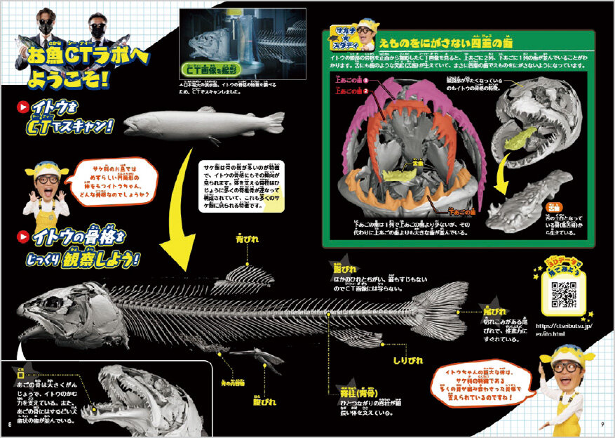 二次元コードから遷移できる「CT生物図鑑」では、お魚たちの骨格をウェブサイト上で360度動かすことができるほか、内部構造を捉えた断面画像等も閲覧できます