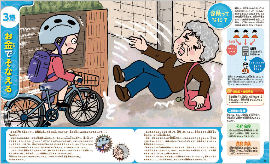 本書は、「世の中を生き抜く力をそだてる!」をコンセプトに、税金や投資など実用的なことがらをビジュアル図解で紹介しています。例えば、保険を小学生にも身近な自転車事故を切り口に取り上げるなど、“自分ごと”としてとらえられるように工夫しました。また、闇バイトやギャンブルなど、類書では取り上げないような要素も「自分の身を守るために、知らないより知っていたほうがいい」という観点で、あえて取り上げています。
