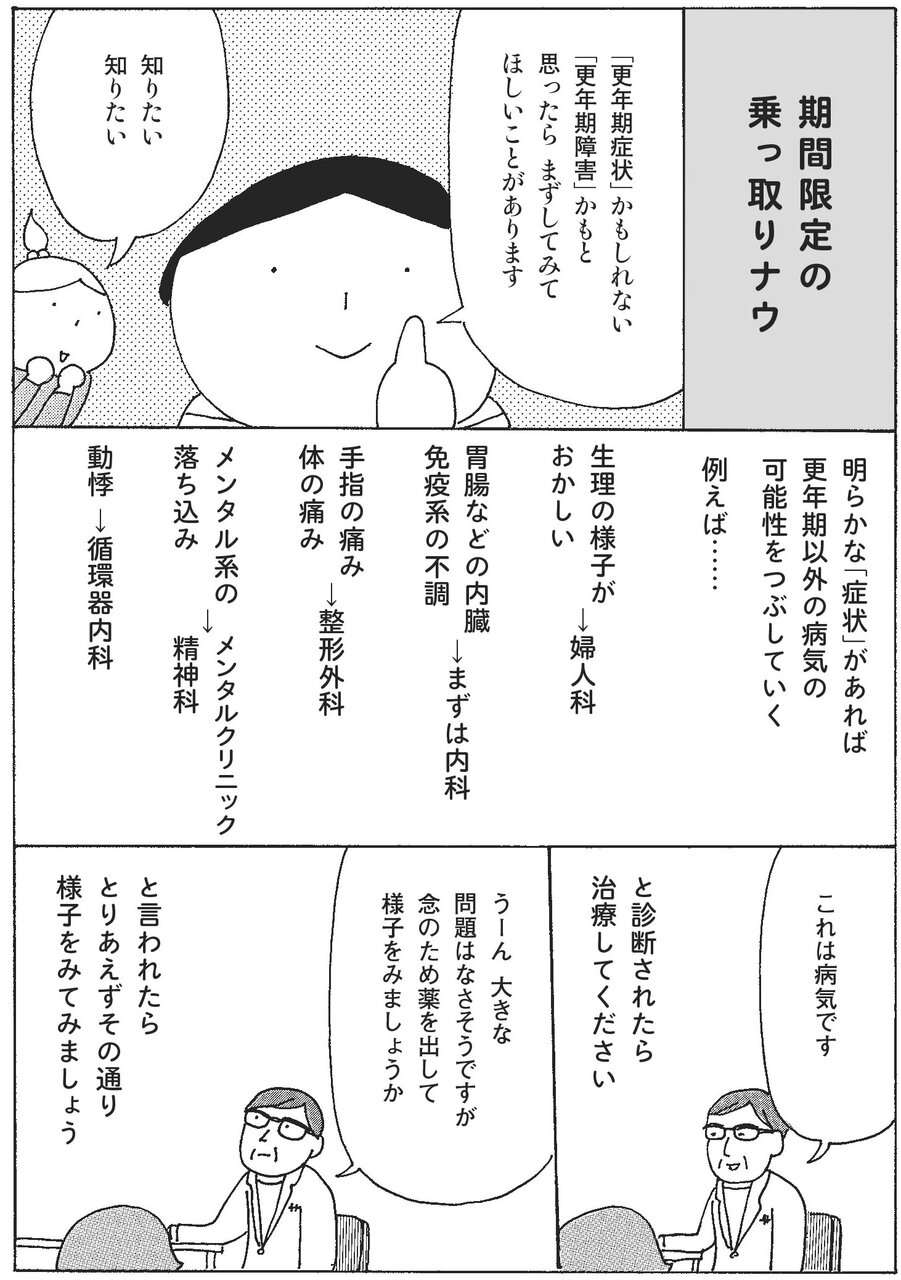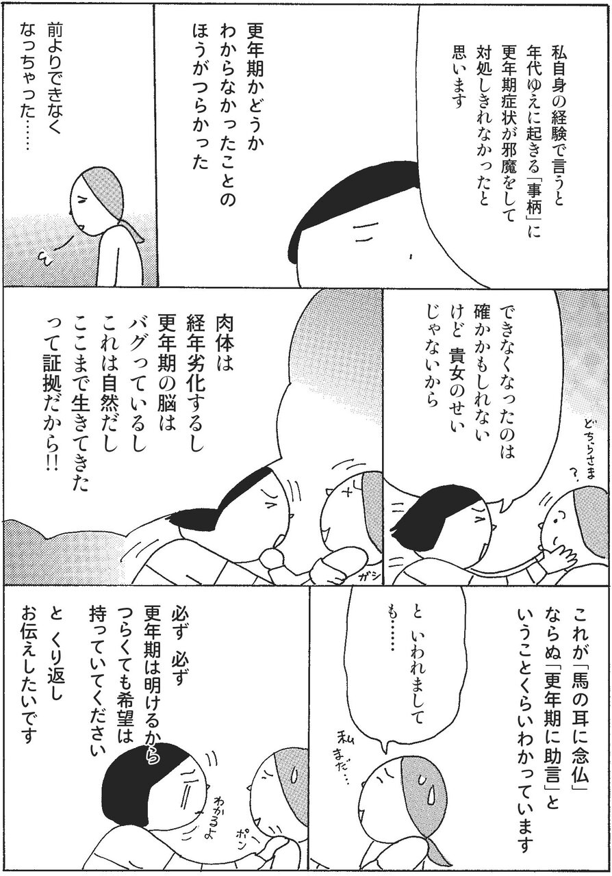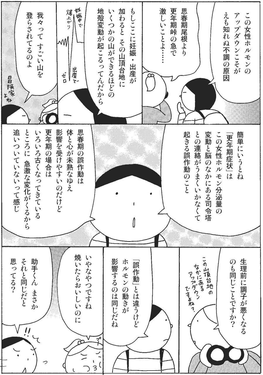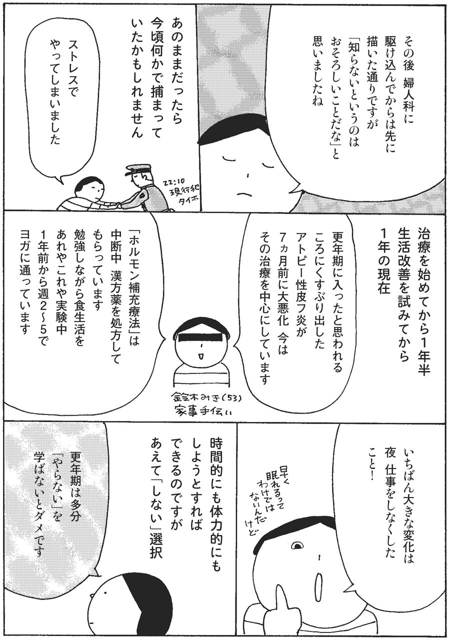 本書は、更年期を迎えた鈴木さんが感じたストレスととまどいがていねいに描かれている。更年期にまつわる知識は、もちろん人生の地図として大きな助けとなるが、その地図を手にして歩くのは、その人自身なのだということもよくわかる作品だ。