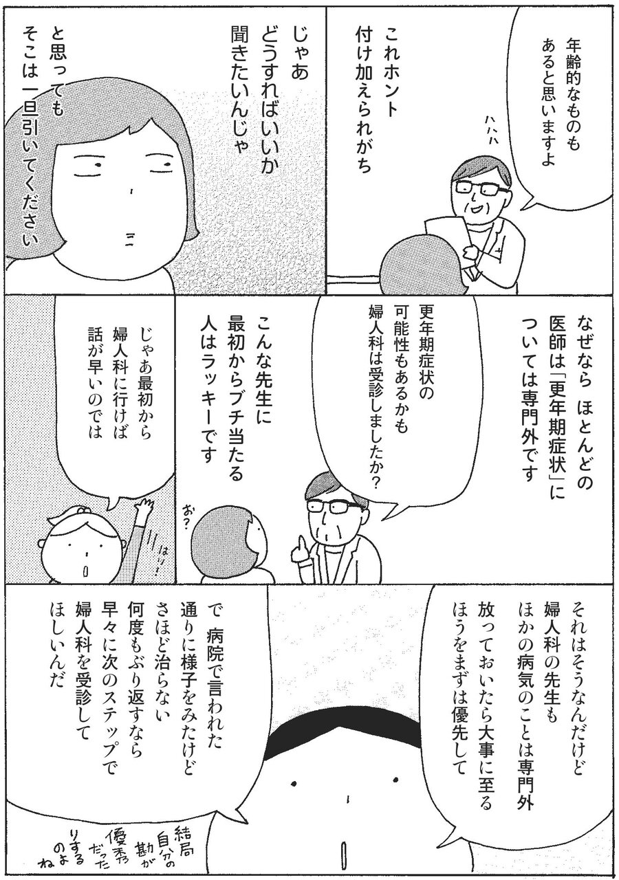 個人的には「婦人科にかかれば、更年期の諸問題はスッキリ解消するだろう」と今まで高をくくっていたので、実はそうでもないらしいとわかったのがとてもよかった。そして鈴木さんが解決の糸口を少しずつ見つけていく過程にはげまされた。