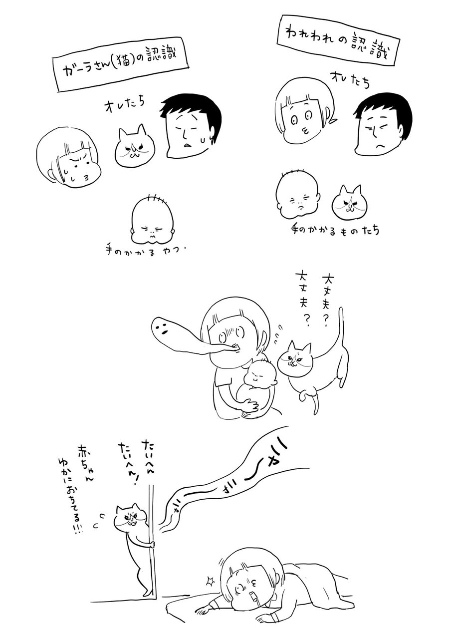 猫のガーラさんが認識する「オレたち」がかわいい。松本さんを気づかい、絶妙な距離感で赤ちゃんに接するガーラさんの毎日も本作の魅力のひとつだ。