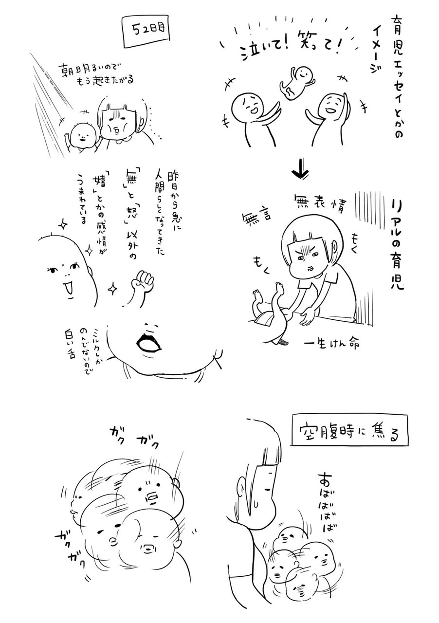 育児のイメージと現実(ぱるたんはよく泣くタイプの赤ちゃんで、松本さんや松本さんの夫とぱるたんとの“攻防”が本作でもたびたび描かれる)の合間に見つけるミルクしか飲んでいない白い舌。きっと、このページを読んで赤ちゃんの白い舌のことをハッと思い出して「そうそう!」と懐かしくなる人も多いんじゃなかろうか。