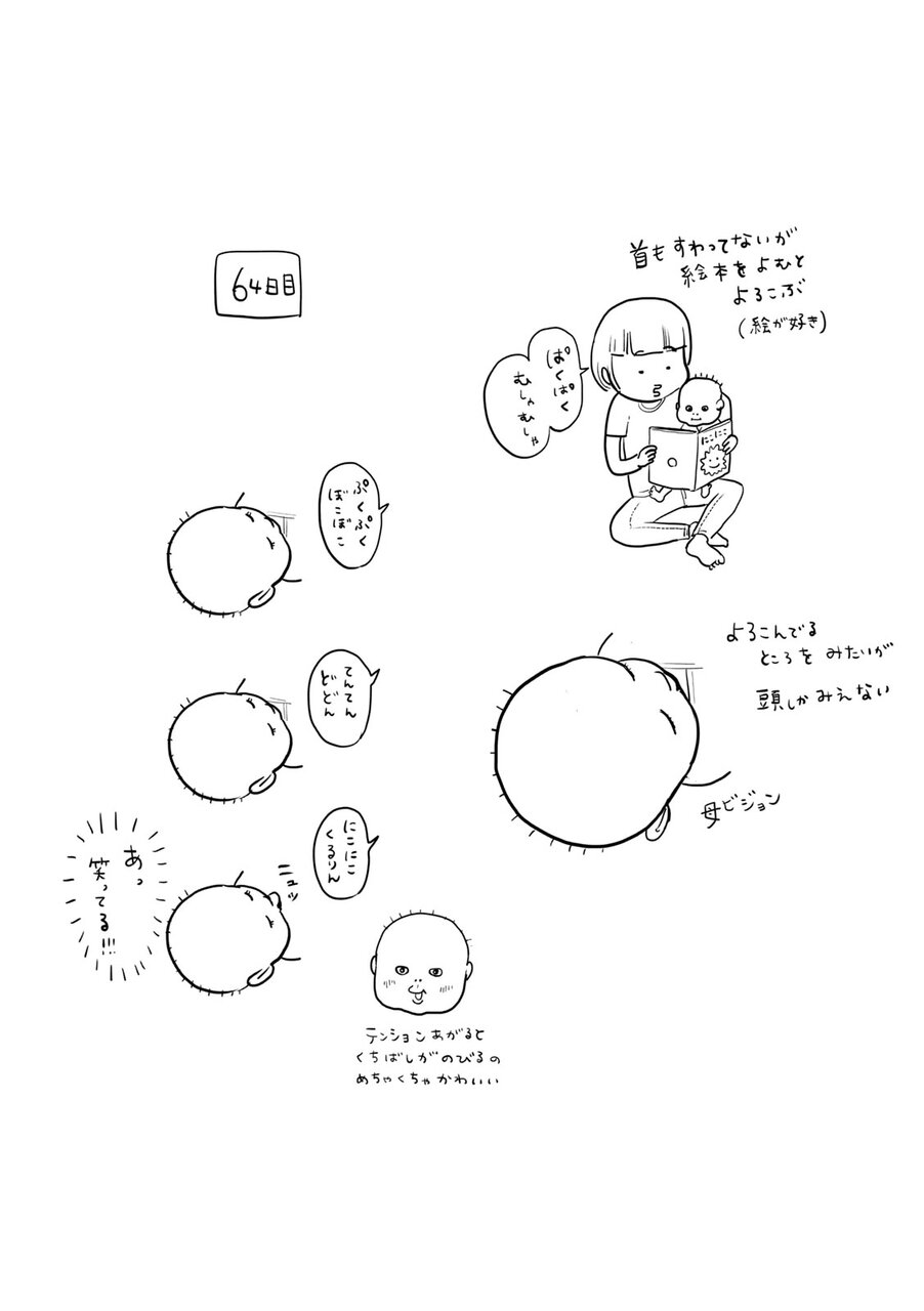 ゲップをさせた直後の表情の容赦ない渋さに笑ってしまう。いい顔だなあ、ぱるたんは本当にこんな顔でお母さんのことを見ていたんだろうな。丸っこい後ろ姿やおひな巻きのみっちり感も愛らしい。
