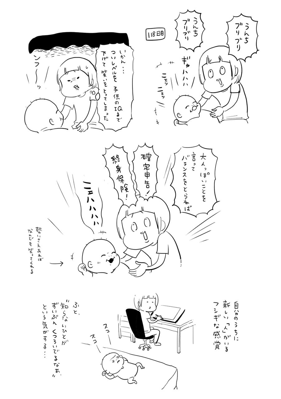 わが子にウケたい一心で連呼する「うんちブリブリ」に、それと同等のウケパワーを持つ「確定申告!」、それから仕事中にふと寝姿を見て感じる「新しい『人』」の気配、ぜんぶたのしい。ぜひ1ページ目から少しずつ読んでほしい。こんなたのしい毎日、ぜんぶ見逃したくない!と思うはずだ。