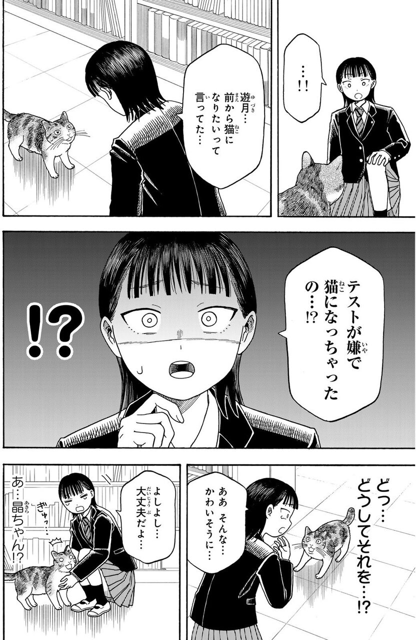 放課後に図書室で勉強を始めたふたり。しかしテスト勉強が嫌すぎて遊月は猫に変身。もちろん、晶の前で猫化するわけにはいかないので、慌てて姿を隠したのですが、突如図書室に現れた猫を見つけた晶は、こんな反応をします。