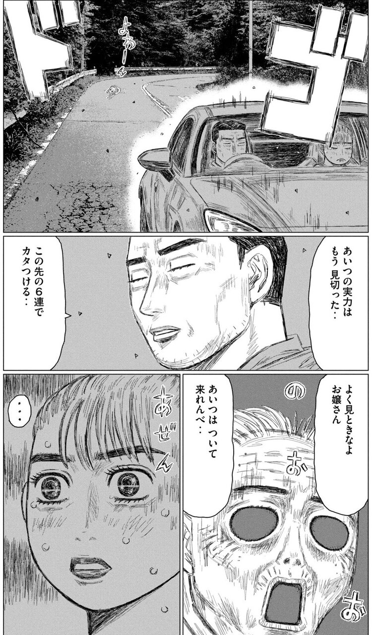 そんなバカな噂を聞き付けた、拓海のかつての走り屋仲間である池谷とイツキ(今はオッサンのガソリンスタンド店員)は、久々に夜の秋名のダウンヒルに挑む。