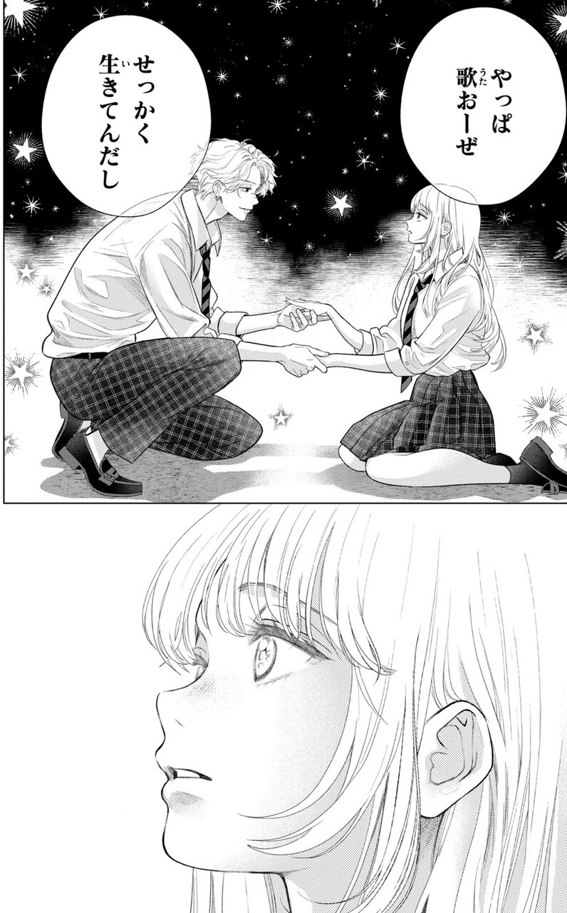 青春がほとばしるような写真! ……でも過去形です。ボーカルの百音の右側にいるのがギターの“快音(かいと)君”。彼は2年半前に交通事故で亡くなり、バンドは自然消滅しました。当時14歳だった百音は16歳になって、友達と遊んだりバイトしたり、それなりに楽しくやっています。でもカラオケには行きません。そして快音君からもらった指輪をずっと肌身離さず持っています。