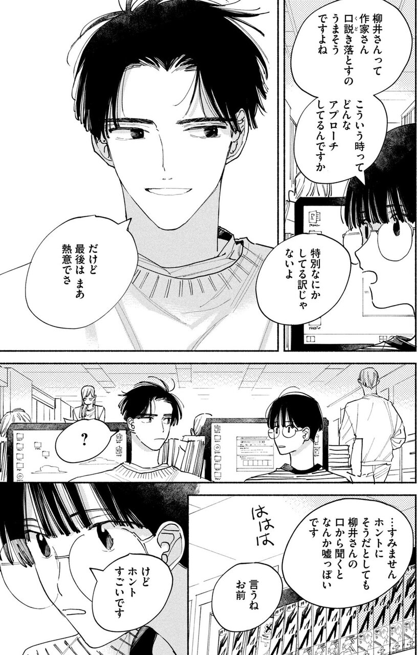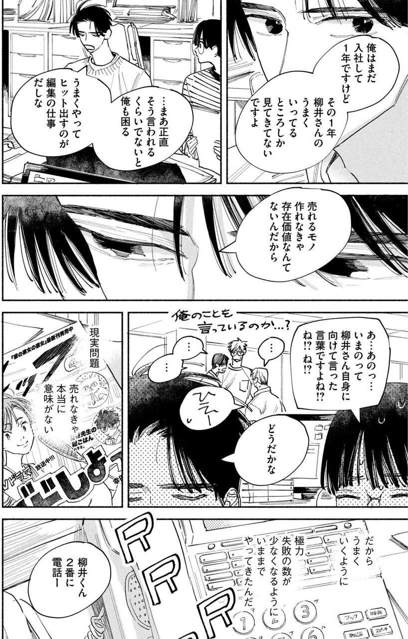 柳井は編集者として3年目の“売れる若手”。やる気はあるものの、失敗しないためにいつの間にか“無難な対応”が染みつき、挑戦や冒険を避けてきたタイプです。