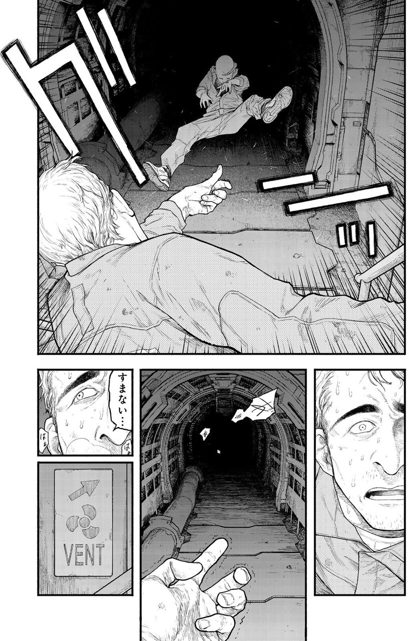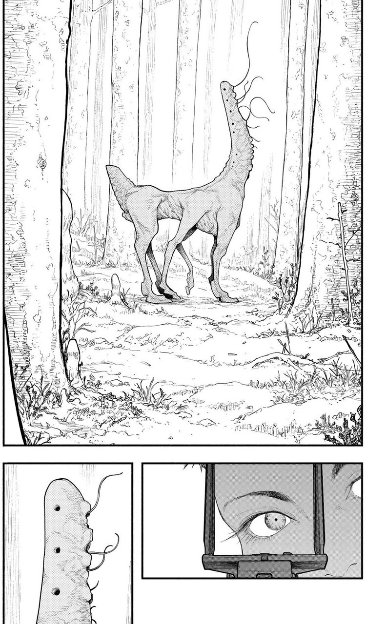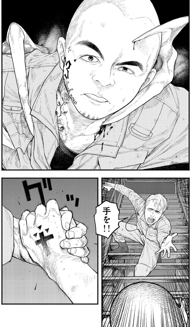 人が得体のしれない何かに捕まり、奥へと引きずり込まれていく様子が描かれています。触手あるいは爪のようなものが、頭や体を押さえつけるその一瞬を切り取ったシーン。集中線やスピード線など、躍動感や瞬間的な動きを表現する手法はいくつかあります。しかしこのコマは、まるで静止画のように止まって見える。謎の生物が人を捕えた、まさにその瞬間を描くと同時に、捕えられた人物の心境をも映すような絶望感溢れる描写に息をのむ。追い打ちをかけるのが、奥へと消えていく様をただ見つめることしかできない、残された人物の表情を描く構成。たった2ページで、謎と恐怖と緊張感を醸成する圧倒的な画力。興奮MAXで始まるオープニングに名作の予感です。