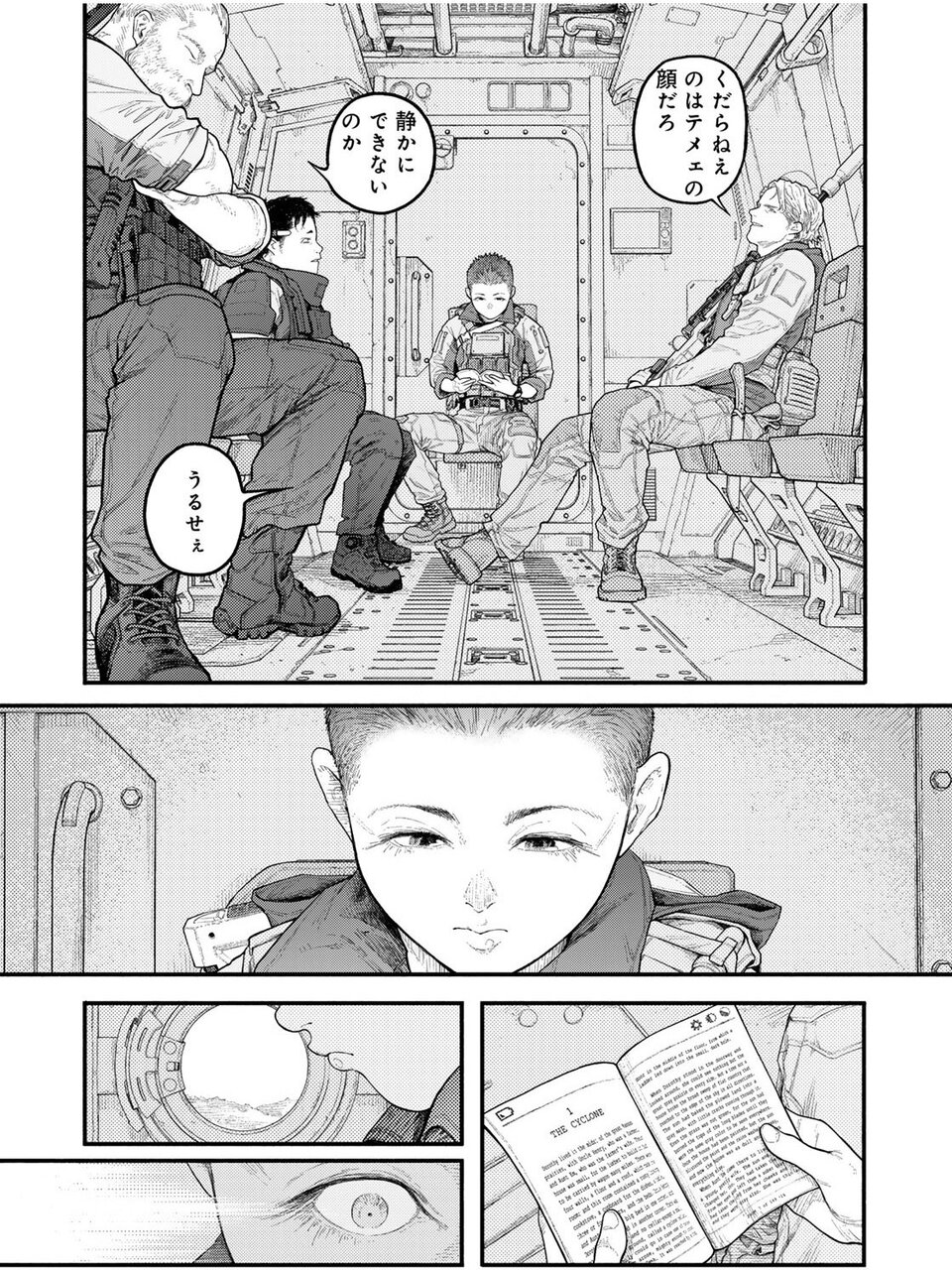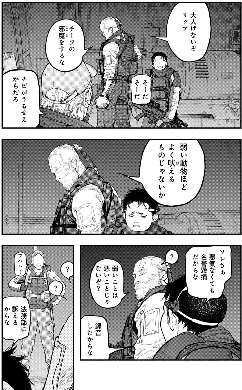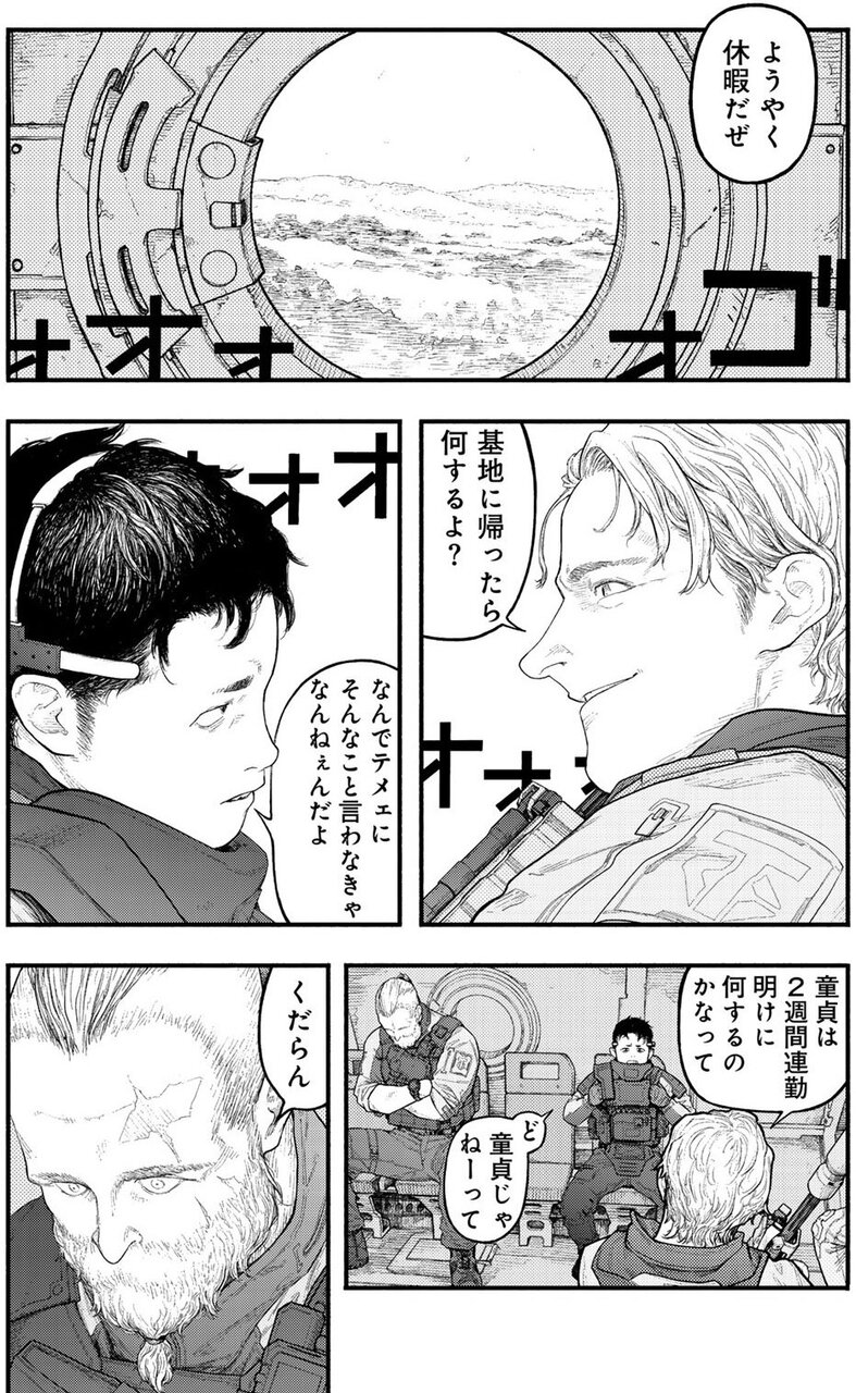 茶化す人、反抗する人、低レベルな会話を一刀両断する人、我関せず&クール、そしてその座り位置から彼らの上に立つ存在であることがうかがえる人。個性や部隊内での関係性も見えてくる、密度の濃いページです。もちろん、この後の展開で各キャラクターたちはより深く描かれ、さらにその魅力を感じることができます。物語の入り口で、最短距離にて人物紹介をする、その構成力に痺れました。
