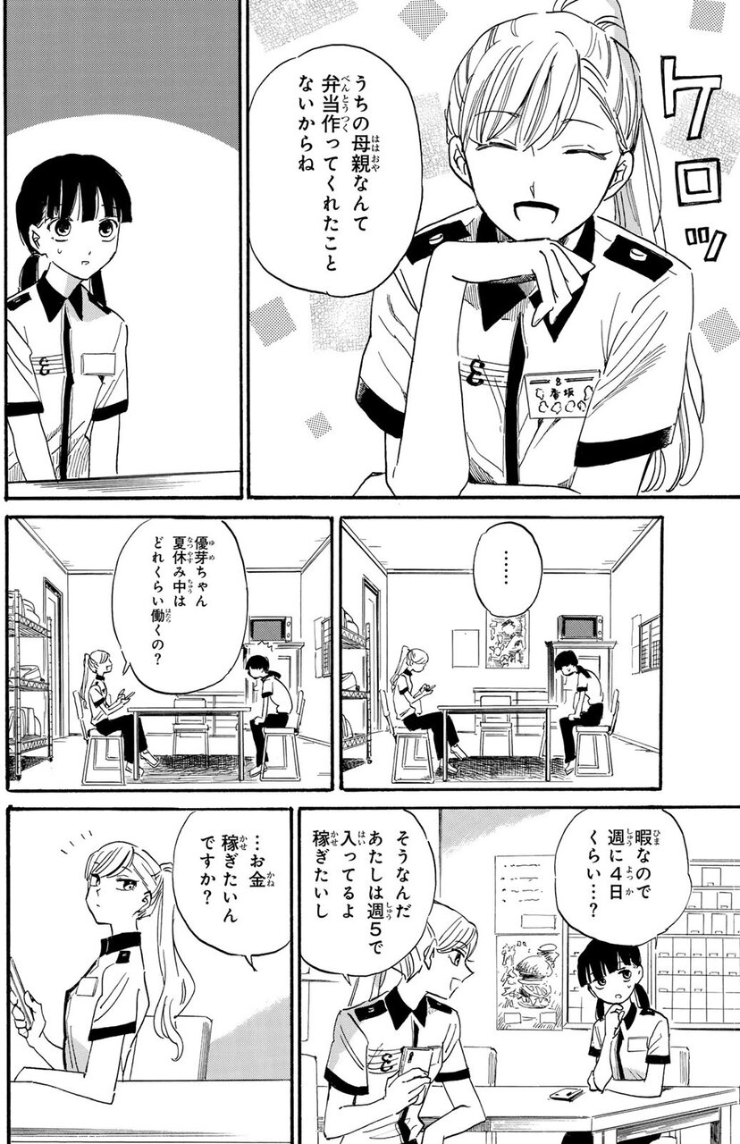 例えば、同僚の “萌夏さん”との休憩中のおしゃべりで浮かび上がるのは「お母さん」のこと。優芽の母親は、厳格で、菜食主義で、ハンバーガーなんてもってのほか!みたいな調子。だから優芽はアルバイトのことを正直に話せていません。