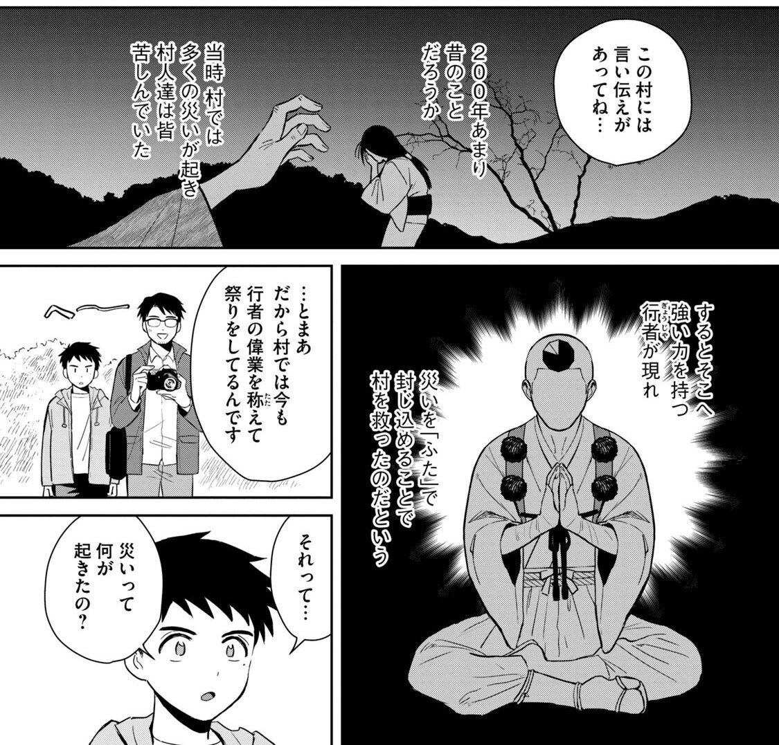 そう言われて育った朔は、村の外のことについて何も知らなかった。村の言い伝えなど嘘だと決めつける遼太に、ならば実際に行者が施した「ふた」を見てみるかと、朔はお堂に誘う。