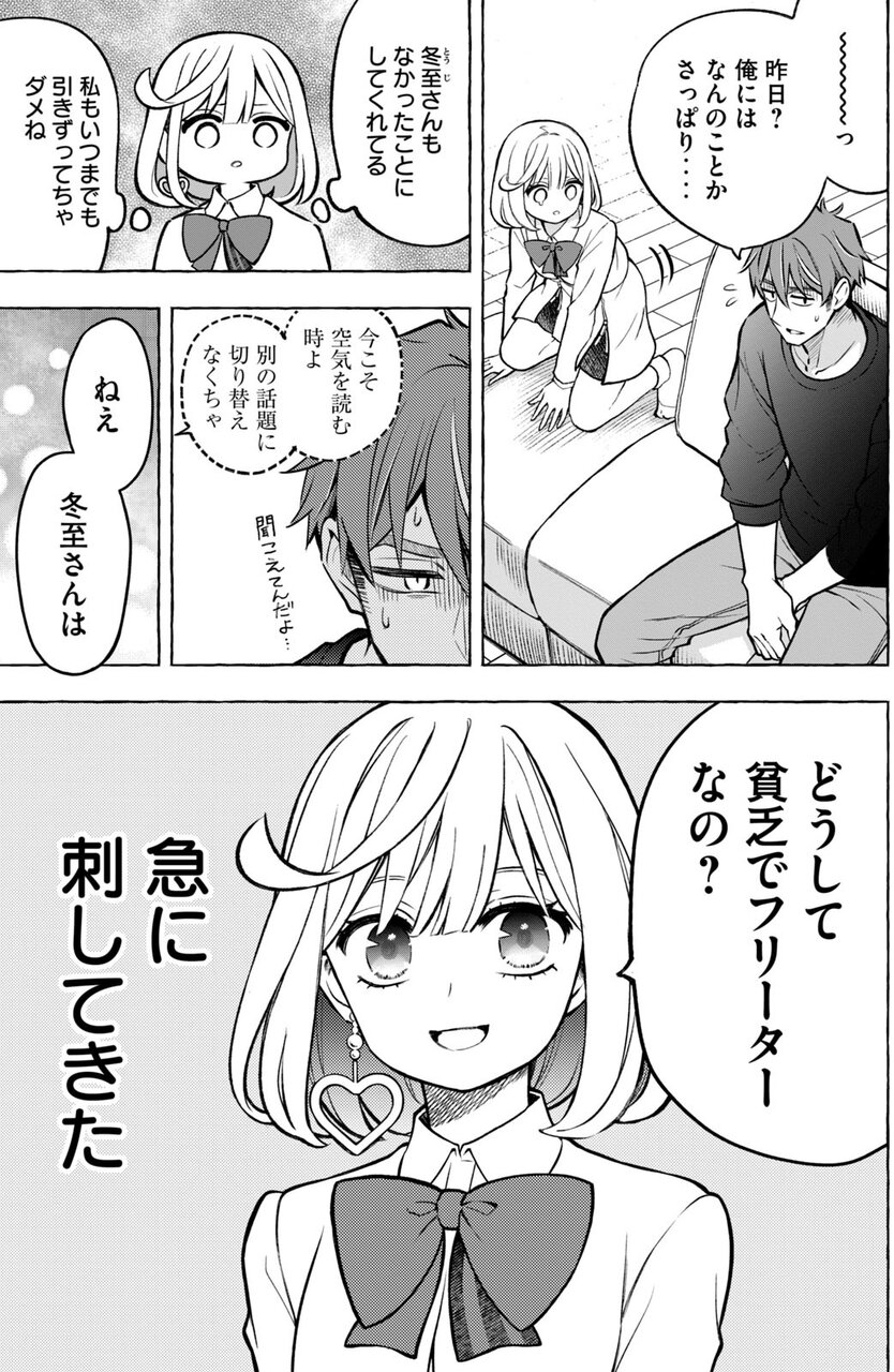 いろいろ複雑な思いがありつつも、冬至はここに住まざるを得ない状況に。陽キャ軍団がすでに退去していたのはラッキーだけど、当面は「天使」こと“夏目咲夜”との2人暮らしになることに冬至は戸惑う。