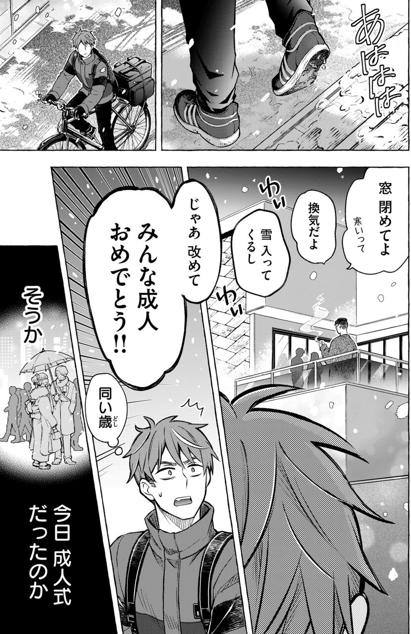 事件のせいで定職につけず、借りた部屋からも追い出されそうな20歳の冬至にとって、節目のはずの成人の日も「ただの1日」にすぎない。