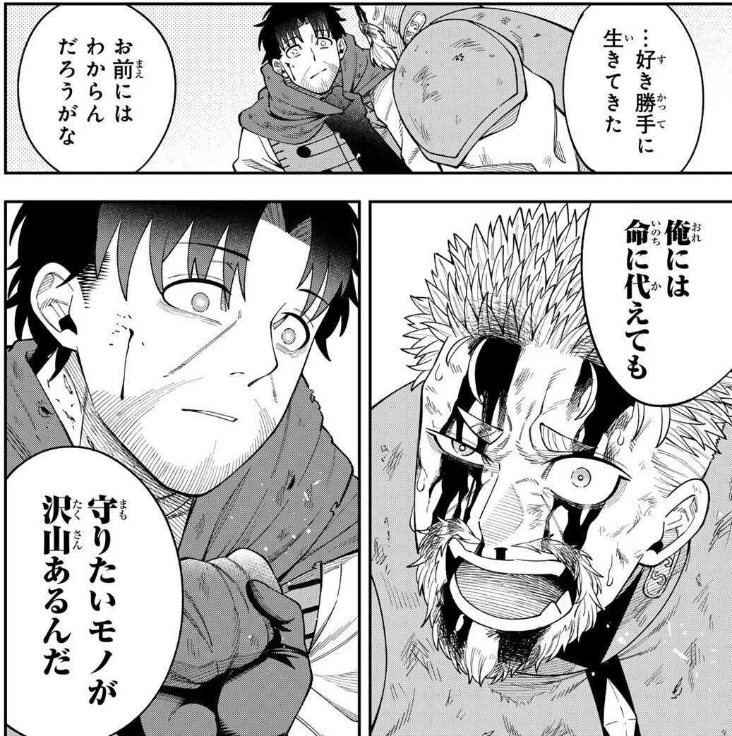 昔馴染みのヂュースというキャラクターが登場するのですが、絶体絶命のピンチに駆けつけたジョンマンに対し、彼はこう言い放ちます。「好き勝手に生きてきたお前にはわからんだろうがな」「俺には命に代えても守りたいモノが沢山あるんだ」と。