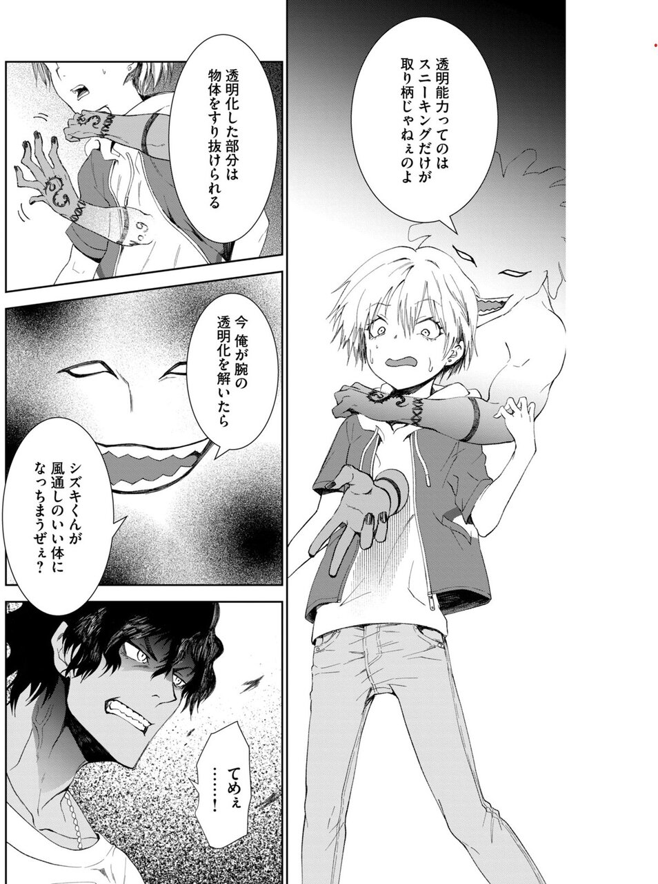 バトルシーンも見逃せません。ゴールデンドーン社側についた能力者・第9(だいく)からの誘いを断ったデジャンとシズキは彼に襲われて絶体絶命のピンチに陥ります。第9の能力は、透明化。