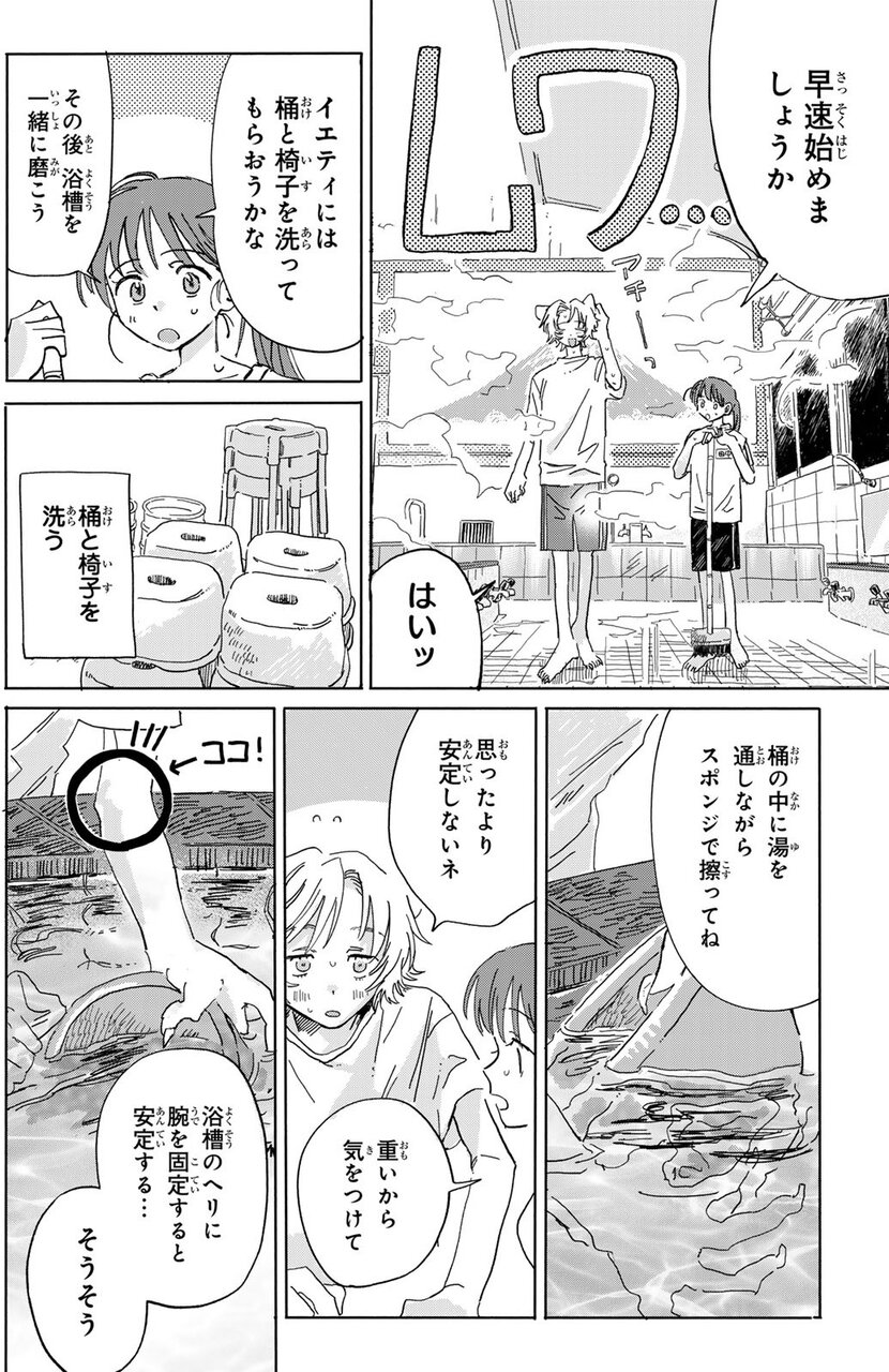イエティの卯塚村でのステイ先は銭湯。高校1年の“田中はな”は、“おばあちゃん”と2人で銭湯を切り盛りしながら暮らしています。