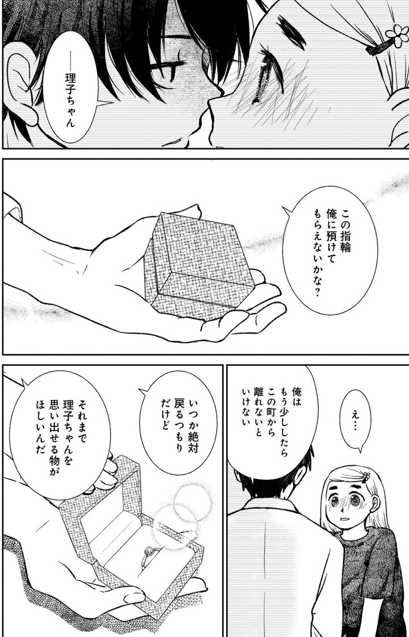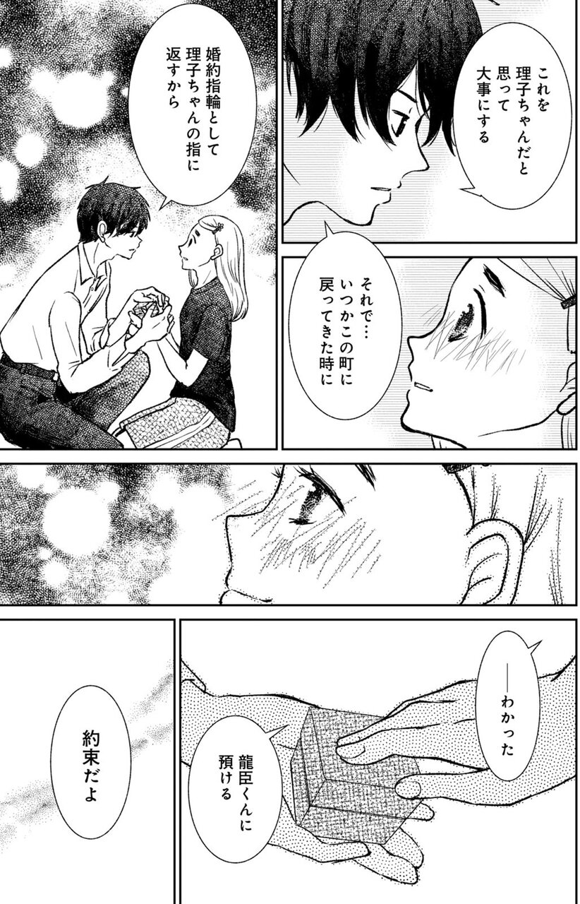 夏の終わり、誕生日を迎えた龍臣に想いを伝え、祖母から譲り受けた指輪を渡して「大人になったら結婚しよう」と約束を交わした翌日、龍臣とその両親は忽然と姿を消します。さらに彼の両親が投資詐欺を行っていたことが発覚し、町は騒然となります。