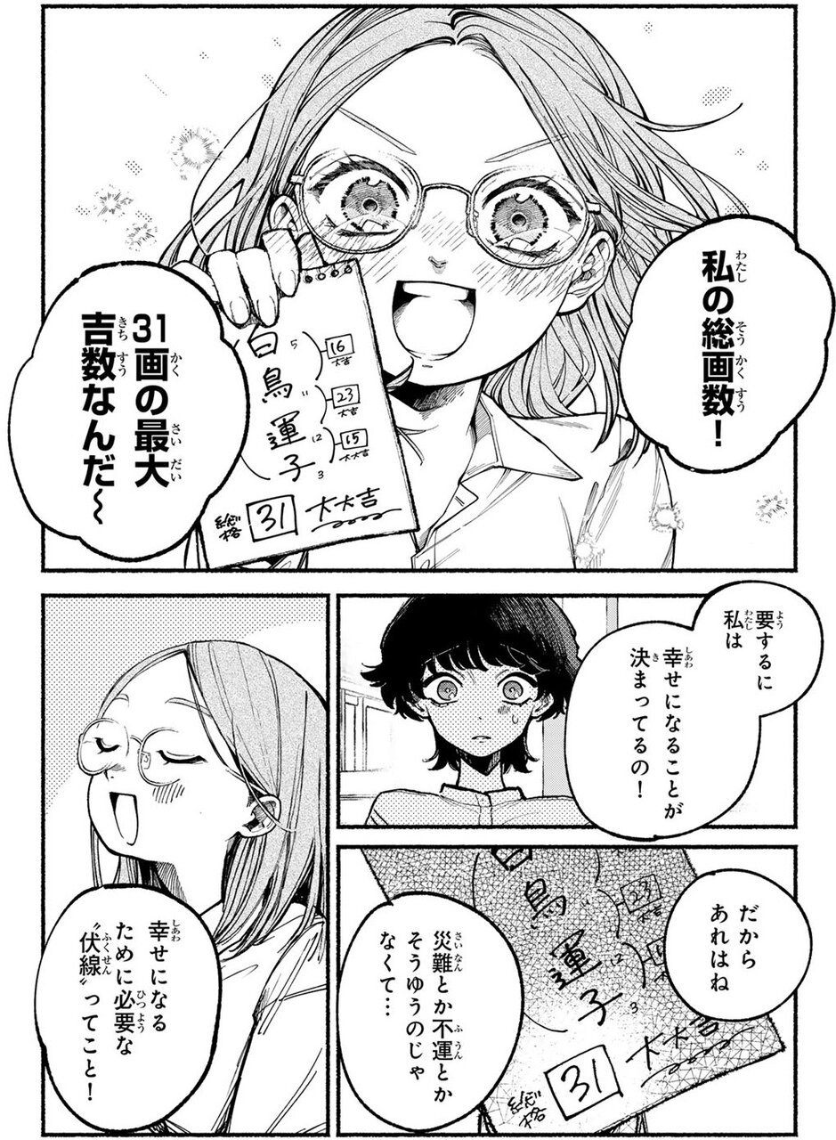 天国と地獄を行き来するような「1ページ後の世界観の反転」に脳をダイレクトに揺さぶられる。「絶対幸せになるって本当に?」と思うほど、ジェットコースター級に私たちを翻弄するのが、この『白鳥運子は31画』というマンガだ。