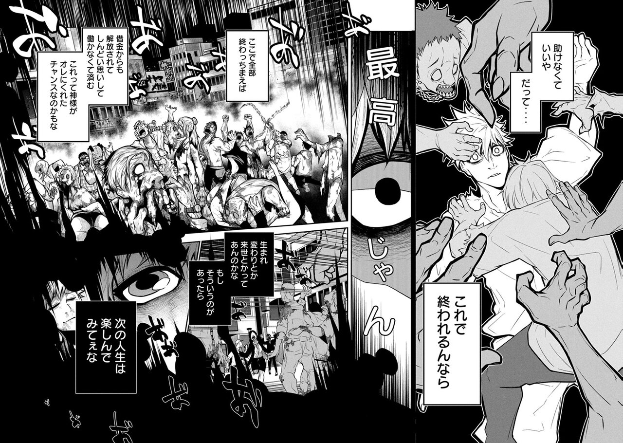 こうして四楽羽はゾンビになった……。と思ったら、意識は人間の時のまま。体はゾンビだから、ほかのゾンビに襲われることもない。借金取りもいない。いやいや金なんて必要ない。ということで、ゾンビライフを楽しむことにした四楽羽。服屋で好きな服を選び、高級缶詰を食べて、行けなかった高校でゾンビ高校生たちと学生生活を送ることに!
